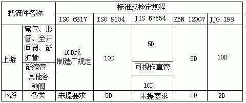 為獲得正常測量精確度,電磁流量傳感器上游也要有一定長度直管段,但其長度與大部分其它流量儀表相比要求較低。90°彎管、T形管、同心異徑管、全開閘閥后通常認為只要離電極中心線(不是傳感器進口端連接面)5倍直徑(5D)長度的直管段,不同開度的閥則需10D;下游直管段為(2~3)D或無要求;但要防止蝶閥閥片伸入到傳感器測量管內。各標準或檢定規(guī)程所提出上下游直管段長度亦不一致,匯集如表1所示,要求比通常要求高,這是由于為保證達到當前0.5級精度儀表的要求。表1