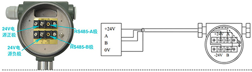 帶RS-485通訊功能的渦街流量計(jì)采用DC24V電源供電,與其它設(shè)備之間采用四線制傳輸方式。儀表端子接線見(jiàn)圖