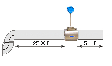 若傳感器安裝點的上游有90°彎并沒有或T形接頭,傳感器上游應有不小于20D的等徑直管段,下游應有不小于5D的等徑直管段。