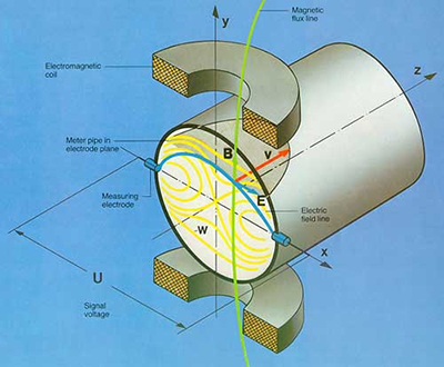 當導電液體沿測量管在交變磁場與磁力線成垂直方向運動時,導電液體切割磁力線產生感應電勢。在與測量管軸線和磁力線相互垂直的管壁上安裝了一對檢測電極,將這個感應電勢檢出。