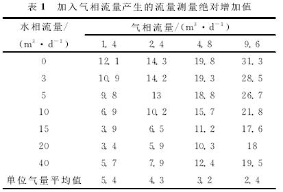 利用清水中渦輪的刻度方程計算加入不同氣體流量后渦輪響應(yīng)頻率所對應(yīng)的流量,即為加入氣體后的測量流量,再用所得測量流量減去配比的標(biāo)準(zhǔn)水流量,得到氣相加入后測量的絕對增加值,即加入氣相流量產(chǎn)生的測量誤差(見表1)。計算結(jié)果表明,加入氣體流量后,渦輪的測量流量明顯增加,尤其是液相流量較低時,增加的測量流量更高,氣體對流量測量產(chǎn)生了較大的測量誤差。低氣量下,平均1m3/d的氣量產(chǎn)生的測量誤差大約相當(dāng)于5m3/d(絕對增加值)。