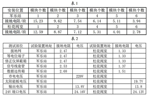 接地網(wǎng)的安裝與連接:接地網(wǎng)是整個(gè)乙二醇流量計(jì)防雷試驗(yàn)比較關(guān)鍵的一個(gè)內(nèi)容,能不能準(zhǔn)確的論證試驗(yàn)的有效性,必須保證接地網(wǎng)達(dá)到標(biāo)準(zhǔn)的接地電阻,通過(guò)對(duì)實(shí)地地電阻率的測(cè)試,初步選擇6個(gè)接地模塊埋設(shè)并配用降阻劑使用,邊安裝邊測(cè)試直到達(dá)到標(biāo)準(zhǔn)值后才引入等電位箱。在軍樂(lè)站和松花閥室安裝模塊并測(cè)試數(shù)據(jù)見(jiàn)表1。