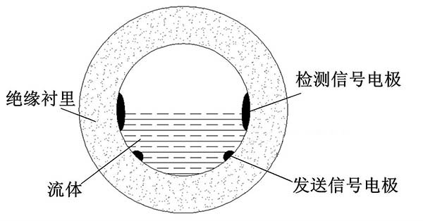 ③利用阻抗或信號(hào)衰減研制的非滿管管道式電磁流量計(jì)。這種結(jié)構(gòu)的非滿管管道式電磁流量計(jì)是當(dāng)前國(guó)內(nèi)研究的方向之一。其結(jié)構(gòu)是流量管底部貼一對(duì)信號(hào)發(fā)射電極,在流量管中間貼信號(hào)接收電極。由于信號(hào)在流體中傳播會(huì)產(chǎn)生衰減,且傳播時(shí)間越長(zhǎng),衰減越多,因此通過(guò)信號(hào)接收電極接收到的信號(hào)衰減量即可得知液面高度;同時(shí)該電極還能測(cè)量流體切割磁感線產(chǎn)生的電動(dòng)勢(shì),以此達(dá)到測(cè)量非滿管流量的目的。阻抗式或信號(hào)衰減非滿管管道式電磁流量計(jì)結(jié)構(gòu)簡(jiǎn)圖如圖5所示。