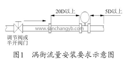 根據圖1渦街流量安裝要求示意圖及廠家的設備說明書要求,流量計上游的直管段長度至少為20D≈1 600mm,下游的直管段至少在5D≈400mm,D=80mm 為管道直徑。圖2為現場安裝圖,流量計上游僅為600mm <1 600mm,此流量計安裝位置有誤,對測量值有一定的影響,造成測量偏差,需調整流量計的安裝位置。