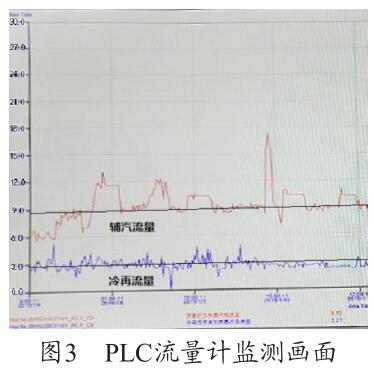 通過圖3 PLC 流量計監測畫面可以看出,PLC 上輔汽測量用的煙氣流量計的量程設置為30t/h,現場設備量程實際為6t/h,兩者嚴重不符,因此測量值4t/h 為錯誤值(單臺機組運行),需要對程序進行修改。