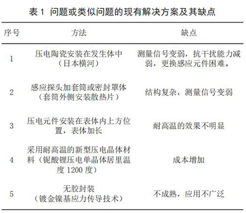 3) 當(dāng)前技術(shù)系統(tǒng)存在的問題。 由于目前使用的傳感器檢測感應(yīng)元件為壓電陶瓷,其極化時居里溫度大約420 ~ 460℃,因此只能在低于 240℃介質(zhì)中使用,一旦被測量介質(zhì)的溫度高于 240℃,二氧化硫流量計傳感器便會因壓電陶瓷達(dá)到居里點(diǎn),絕緣電阻降低,壓電信號變?nèi)醵А?br /> 4)問題或類似問題的現(xiàn)有解決方案及其缺點(diǎn)(見表 1)。