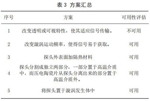 3)查找沖突矩陣,得到如下發(fā)明原理:No.32 改變顏色、No.19 周期性作用、No.24 中介物。方案一:依據(jù)No.32 改變顏色發(fā)明原理,得到解如下:改變透明或可視特性,使其適應(yīng)信號傳輸。方案二:依據(jù) No.19 周期性作用,得到解如下:改變漩渦運(yùn)動頻率,使得信號易于獲取。方案三:依據(jù) No.24中介物,得到解如下:探頭外表面加真空絕熱材料。