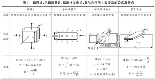 易錯點2:磁強計、印染污水流量計、磁流體發電機、霍爾元件間的區別與聯系磁強計、印染污水流量計、磁流體發電機、霍爾元件都是利用電磁場對帶電粒子的偏轉效應,并且穩定時電場力與磁場力均達到平衡。很多學生容易將其混淆,遇到問題常常搞不清原理,亂代公式,筆者特將4者涉及的公式及特點等做一對比區別如表1所示。