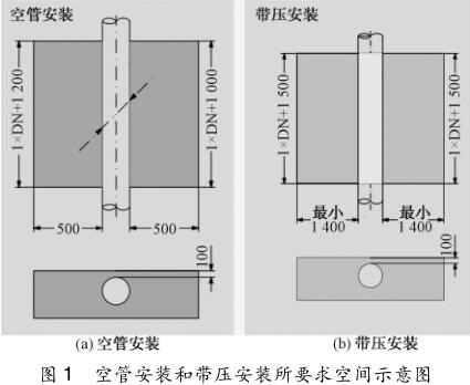 (1)要確認在用液體流量計的管壁厚度及內襯材料特性,保證換能器在管段內壁的突出長度;(2)用氣焊切割液體流量計外殼時,一定要在管道內充滿水的情況下(*好是帶壓并繼續保持管內水在運行流動的狀態)進行,以免內襯受熱凸起變形影響流態;(3)要有足夠安裝空間(流量井),可以用原有的流量井,但管壁與流量井墻壁*小距離不小于 500 mm,流量井長不小于 1. 5 倍管徑。超聲波流量計空管安裝和帶壓安裝要求空間如圖 1 所示。