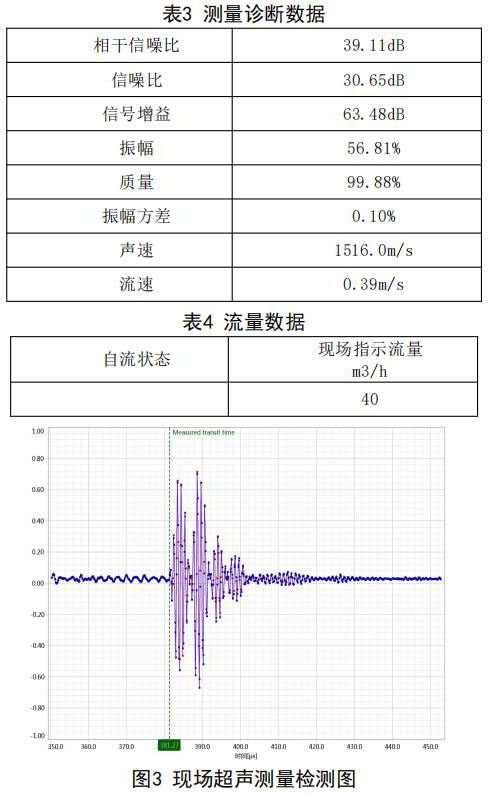 在機(jī)組自流補(bǔ)給水狀態(tài):同樣采用德國(guó)FLUEX 高精度外夾式超聲波流量計(jì)作為標(biāo)準(zhǔn)流量計(jì),測(cè)量 基礎(chǔ)數(shù)據(jù):管道外徑276.93mm,管壁厚度12.40mm, 采用兩聲程169mm傳感器安裝距離,通過(guò)對(duì)超聲波流量計(jì)信號(hào)分析與診斷(數(shù)據(jù)見(jiàn)表3和表4),超聲 波流量計(jì)測(cè)量狀態(tài)符合條件,開(kāi)始測(cè)量,打開(kāi)凝汽 器入口閥門,流量測(cè)量情況如下