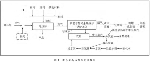 在有色金屬冶煉過程中,將原料、燃料和輔助材料根據熱平衡原理按一定比例進行配料,配料后的物料與空氣或高含氧的混合空氣在熔煉爐中進行氧化或還原反應,熔煉出有色金屬產品。同時,在熔煉過程中會產生大量的高溫煙氣( 1200 ℃ 左右),高溫煙氣經過余熱鍋爐時,與余熱鍋爐水側的軟化水進行熱量交換,煙溫迅速降至 250℃ 以下,再經收塵、制酸或脫硫裝置進一步收塵、降溫、凈化,*終達標排放。余熱鍋爐水側的軟化水經熱量交換后產生中壓飽和蒸汽(4 MPa 左右),送至余熱發電機組發電。具體的工藝流程如圖 1 所示。