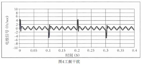 工頻干擾是電磁管道流量計(jì)常見的干擾源。當(dāng)流量計(jì)處于電源形成電磁場(chǎng)中時(shí),由于分布電容的存在,以電磁波的輻射形式干擾電極信號(hào),或者是由供電電源引入的工頻串?dāng)_,工作現(xiàn)場(chǎng)的工頻共模干擾,其產(chǎn)生的物理機(jī)理均是電磁感應(yīng)原理。幅度與流量信號(hào)相比,往往要大幾個(gè)數(shù)量級(jí),頻率與供電電源頻率相同。如圖4所示,線圈驅(qū)動(dòng)頻率為5Hz的電極信號(hào),被耦合了50Hz的工頻干擾,幅度大概相當(dāng)于1feet/s。