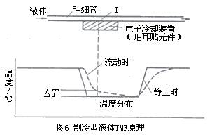 液體用tmf 在20世紀(jì)90年代初中期開始發(fā)展并在工業(yè)生產(chǎn)中應(yīng)用,但當(dāng)前主要為微小流量儀表。有消耗功率測量法的熱分布式tmf和利用珀?duì)柼? peltier)致冷元件在檢測部位致冷(即附加熱)的tmf。后者的測量原理如圖6所示,流量傳感器由測量毛細(xì)管、電子冷卻裝置(珀?duì)柼?和3各溫度檢出件組成。測量管和致冷元件接觸,無液體流動(dòng)時(shí)冷卻到某一溫度時(shí),兩者溫度相等;液體流動(dòng)時(shí)致冷元件附近測量毛細(xì)管溫度上升,如虛線所示分布,測量溫度檢測點(diǎn)的兩者溫度差以求的流量。