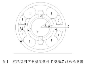 T型磁芯是為較小的空間下實現盡可能大的勵磁線圈而提出的,如圖1所示為較小空間結構下,設計有T型磁芯的井水流量計傳感器截面圖。在圖中1表示線圈位置;2表示磁芯位置;3表示電極及其固定器件位置;4表示襯里位置;5表示內徑壁位置;6表示外徑壁;7表示測量管道(測量區域)。如圖1所示井水流量計勵磁結構磁芯造型近似為T型(因稱為T型磁芯),磁芯在靠近井水流量計內管道時為T型磁芯的較長端。如圖中所示,T型磁芯較長端與x軸夾角為a,T型磁芯較短端與x軸夾角為b,T型磁芯較長端寬度為k1,T型磁芯較短端寬度為k2。