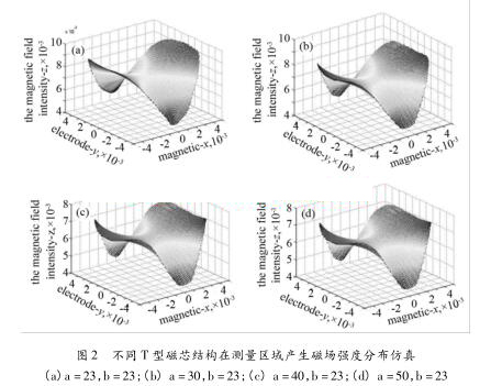 如圖2所示為不同T型磁芯結構在井水流量計測量區域產生磁場強度分布仿真圖。由于篇幅原因,這里只顯示了k1/(k1 + k2)為1/2,b 為23°的仿真圖。圖2(a),(b),(c),(d)分別顯示的是a為23°,30°,40°,50°時井水流量計測量區域截面磁場仿真圖,從仿真圖中可以發現當磁芯所占空間減小,勵磁線圈空間增大時,流量計內部測量區域中的磁場強度總體上有所增加。在仿真實驗中,將所得的仿真數據保存,對其運用磁場評價指標進行下一步的數據分析。