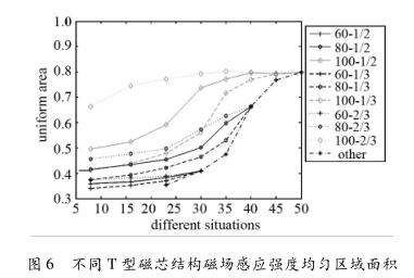 如圖6所示為不同T型磁芯結構下測量區域磁場感應強度均勻區域面積,圖中橫坐標為T型磁芯b的角度,縱坐標為測量區域磁場強度分布的均勻區域面積,圖標圖例與圖3中一致。從仿真結果可以看出:T型磁芯的較長端的角度a為越小,流量計測量區域中磁場強度均勻區域面積越大;在T型磁芯的較長端的角度a一定時,T型磁芯的較短端的角度b越小,流量計測量區域中磁場強度均勻區域面積越大;在T型磁芯的較長端的角度a與較短端的角度b一定時,T型磁芯的k1/(k1 + k2)越小,在流量計測量區域中磁場強度均勻區域面積越大。